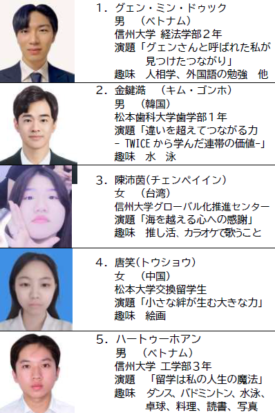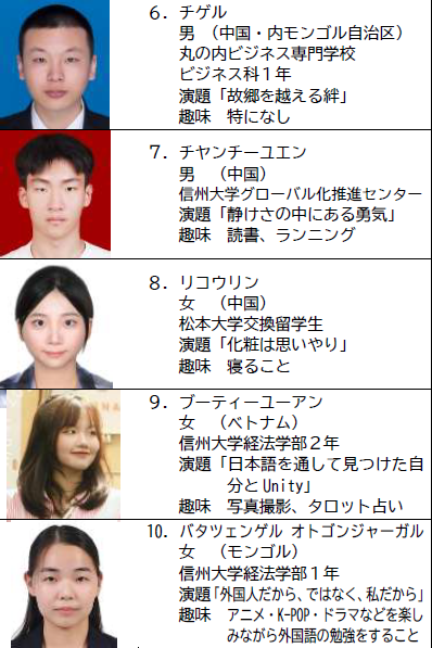 今年は、長野県内の大学や専門学校に通う中国、韓国、ベトナム、台湾、モンゴルなど13ヶ国の留学生42名からの応募があり、事前選考で選ばれた10名が壇上に登りました。そして、1人5分の持ち時間の中で推奨テーマである「Unity~連帯」に基づき、日本での生活の中での体験や感じたことについて日本語でスピーチしました。