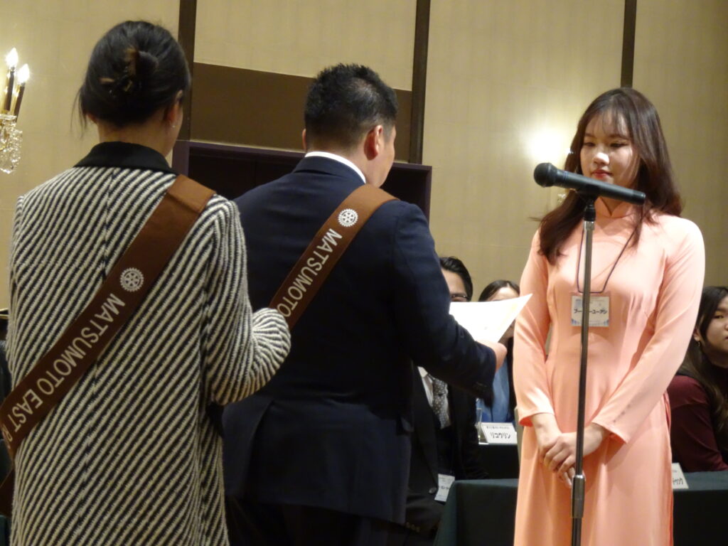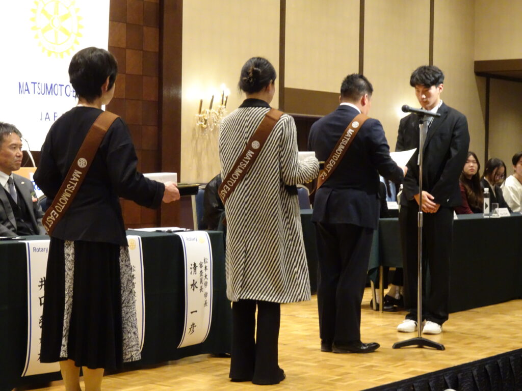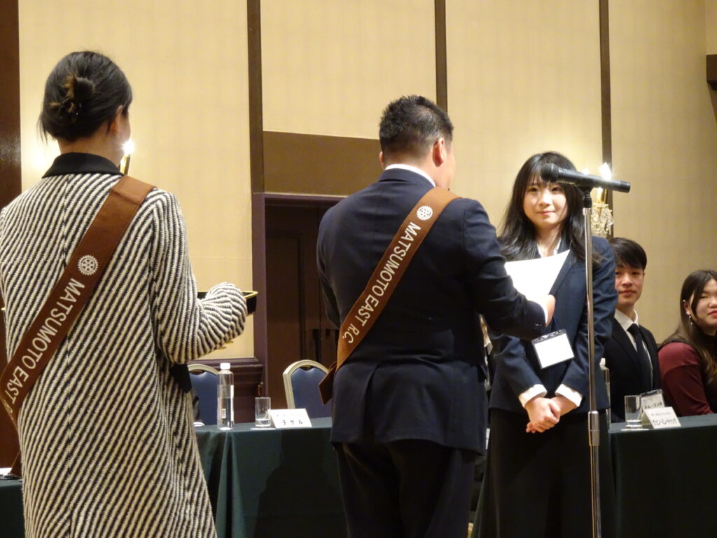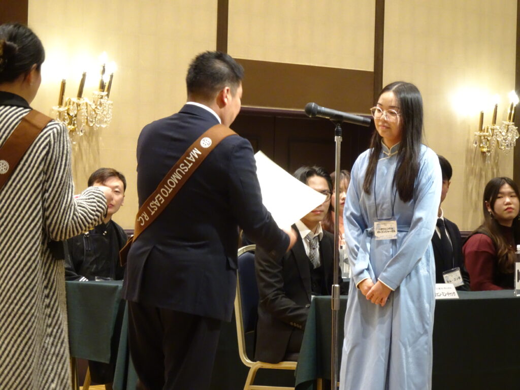 審査は教育・行政・マスコミ関係者等6名で行われ、信州大学のチヤンチーユエンさんと松本大学のリコウリンさんが同率で第1位に選ばれ、それぞれに表彰状と賞金5万円が村山会長より贈られました。
